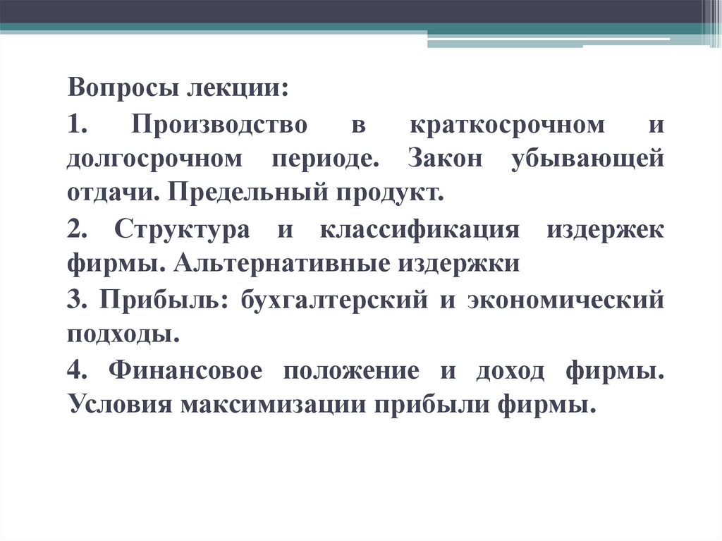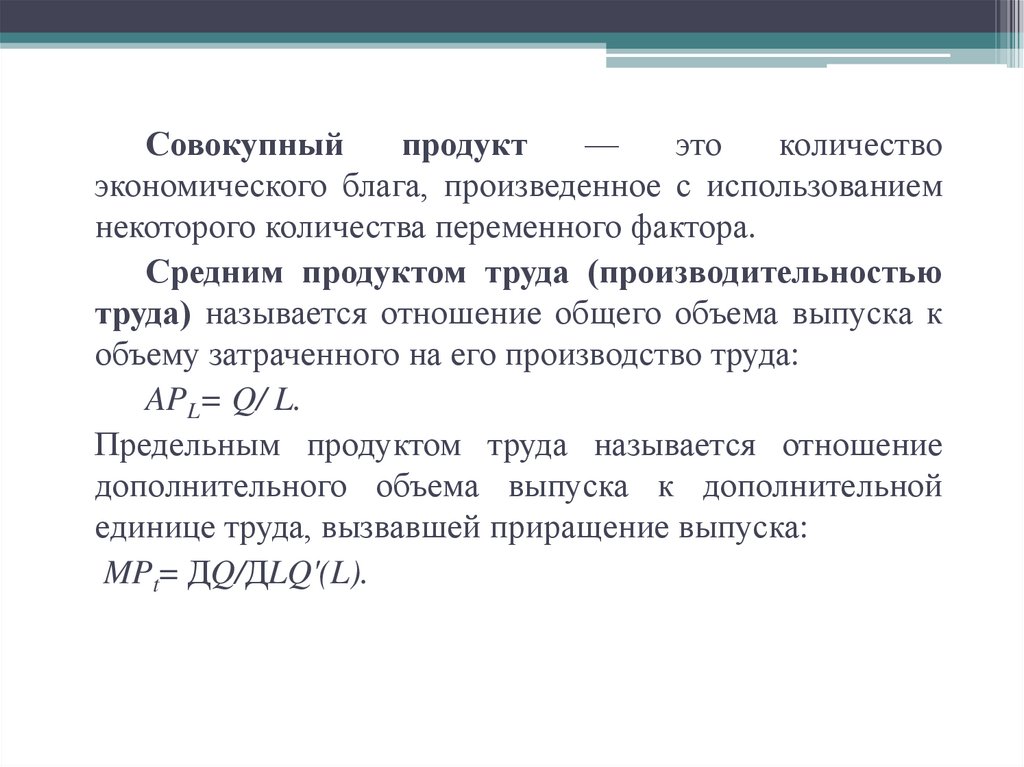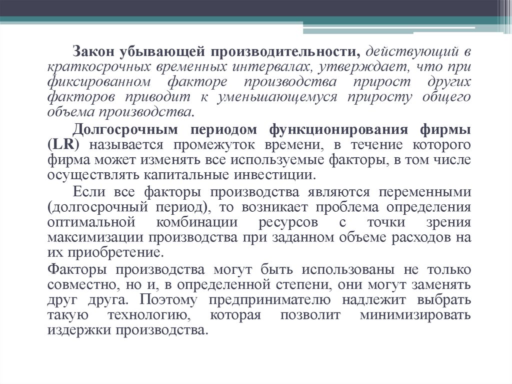 Закон убывающей производительности, действующий вкраткосрочных временных интервалах, утверждает, что при