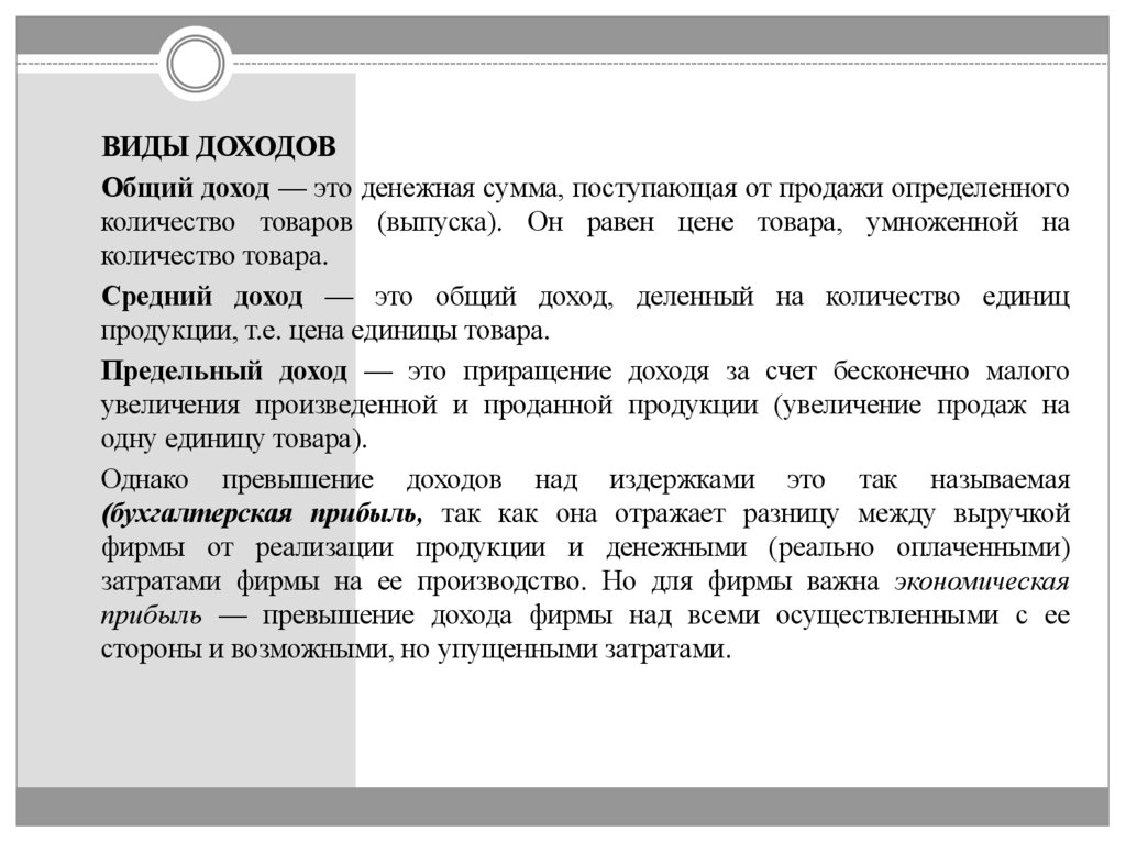 ВИДЫ ДОХОДОВОбщий доход — это денежная сумма, поступающая от продажи определенного