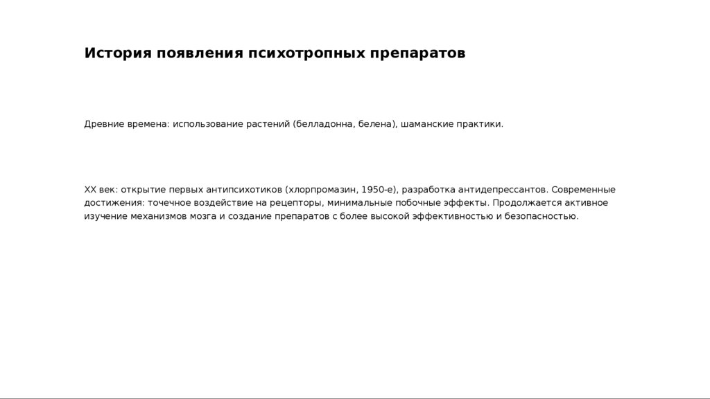 История появления психотропных препаратовДревние времена: использование растений (белладонна, белена), шаманские практики.