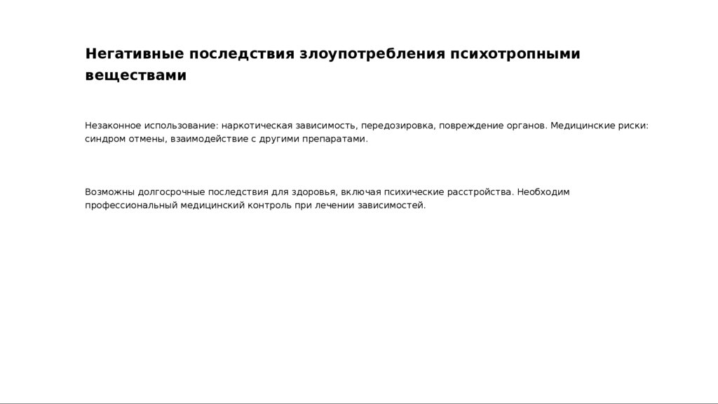 Незаконное использование: наркотическая зависимость, передозировка, повреждение органов. Медицинские риски: