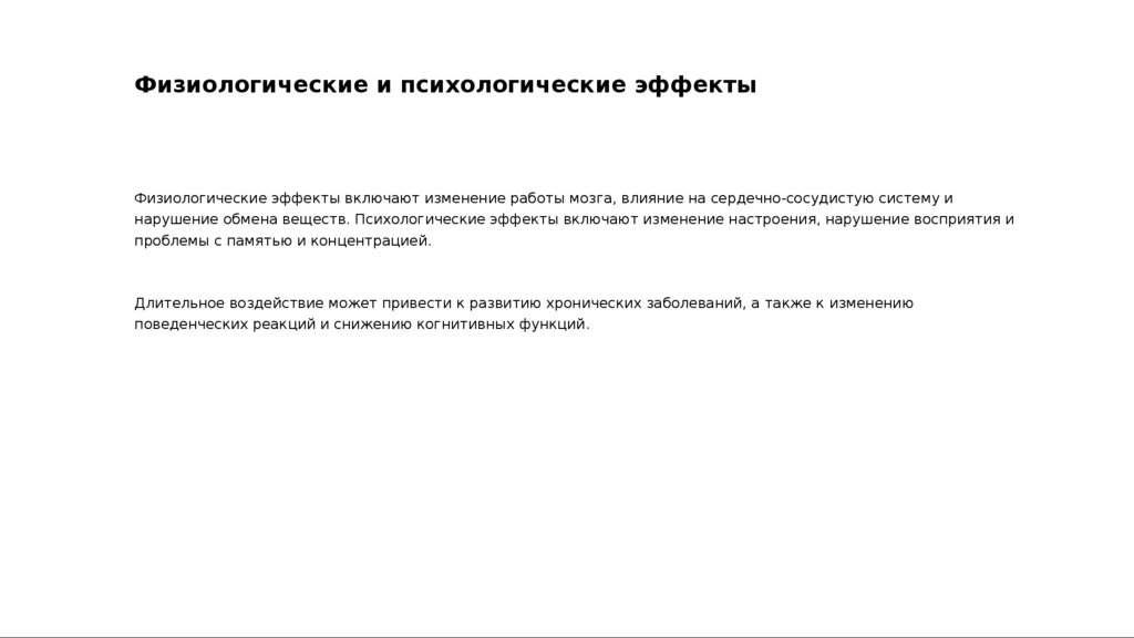 Физиологические и психологические эффектыФизиологические эффекты включают изменение работы мозга, влияние на сердечно-сосудистую систему и