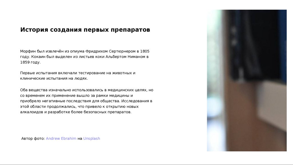 История создания первых препаратовМорфин был извлечён из опиума Фридрихом Сертюрнером в 1805