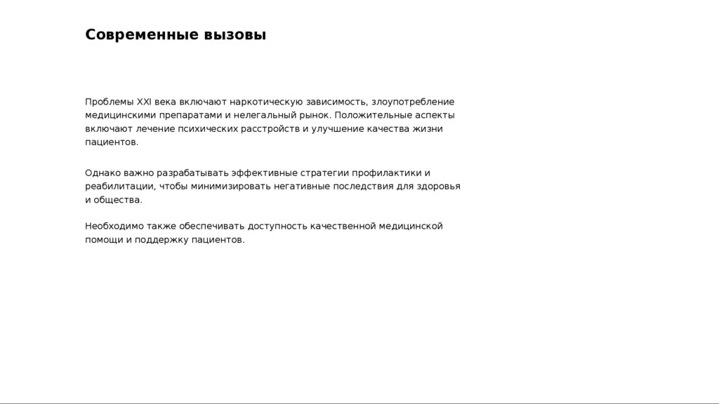 Современные вызовыПроблемы XXI века включают наркотическую зависимость, злоупотребление