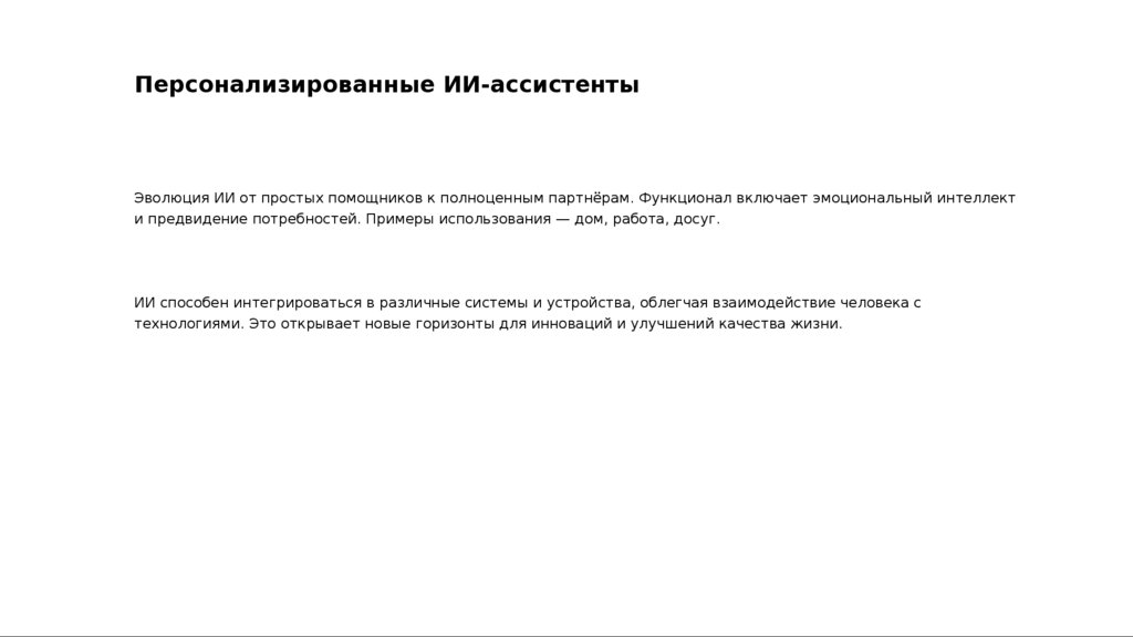 Персонализированные ИИ-ассистентыЭволюция ИИ от простых помощников к полноценным партнёрам. Функционал включает эмоциональный интеллект