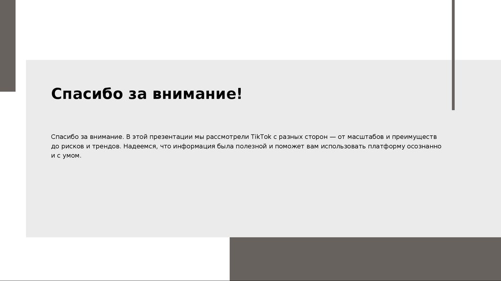 Спасибо за внимание!Спасибо за внимание. В этой презентации мы рассмотрели TikTok с разных сторон — от масштабов и преимуществ