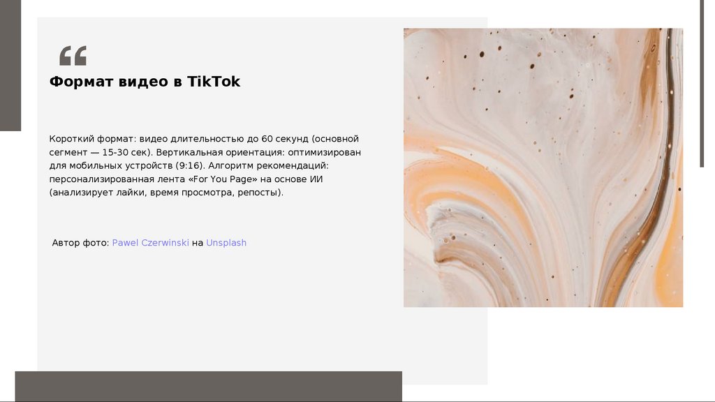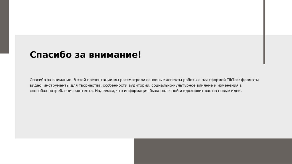 Спасибо за внимание!Спасибо за внимание. В этой презентации мы рассмотрели основные аспекты работы с платформой TikTok: форматы