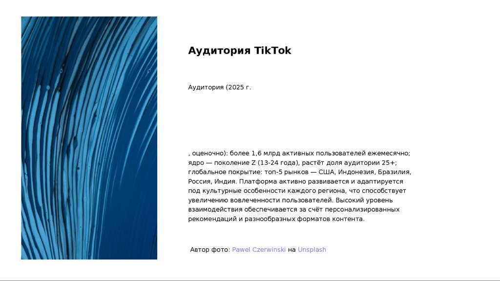 вирусных трендов (мода, танцы, мемы); новый канал для малого бизнеса (microinfluencers, UGC-реклама); платформа для образования («edutainment»: короткие