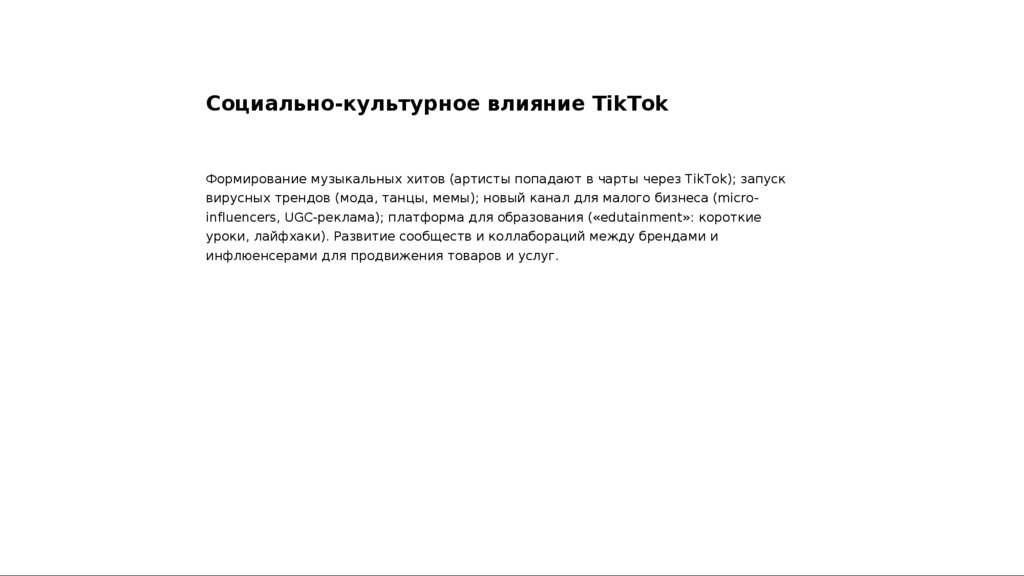 Социально-культурное влияние TikTokФормирование музыкальных хитов (артисты попадают в чарты через TikTok); запуск