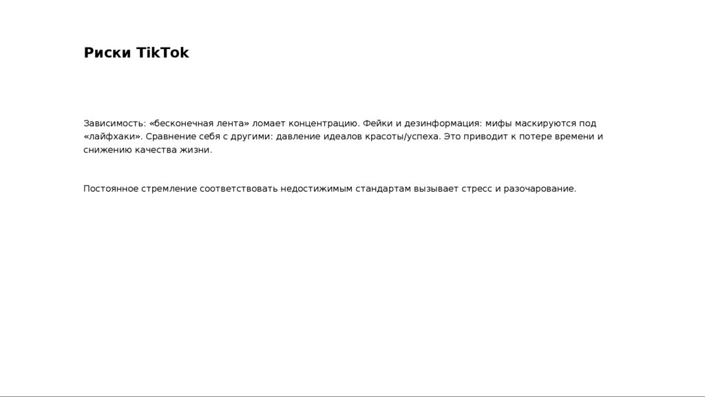 Риски TikTokЗависимость: «бесконечная лента» ломает концентрацию. Фейки и дезинформация: мифы маскируются под