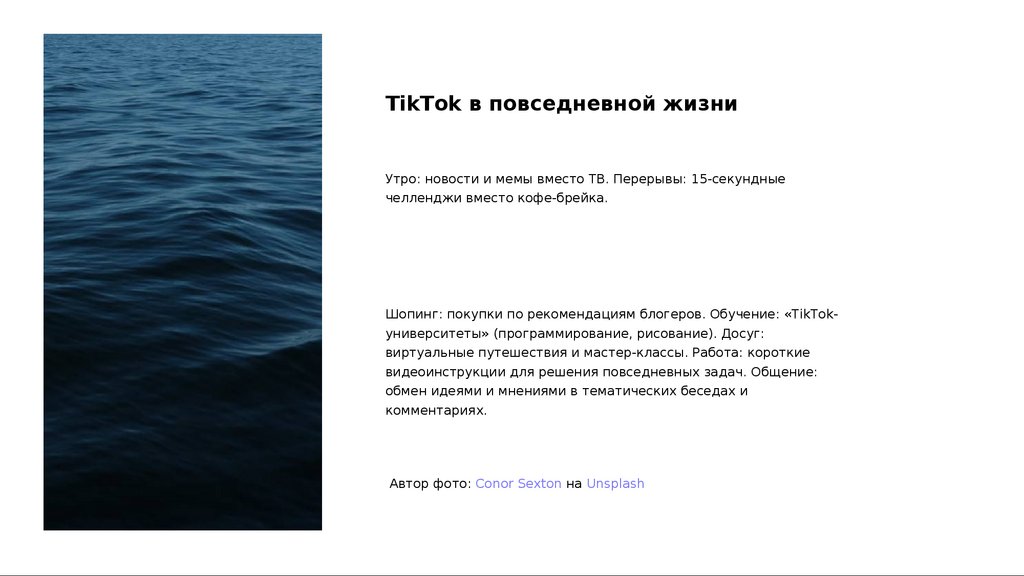 Шопинг: покупки по рекомендациям блогеров. Обучение: «TikTokуниверситеты» (программирование, рисование). Досуг: