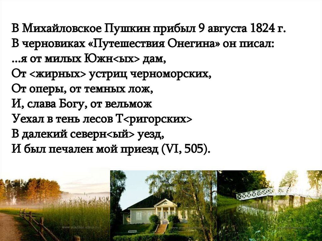 В Михайловское Пушкин прибыл 9 августа 1824 г.В черновиках «Путешествия Онегина» он писал: