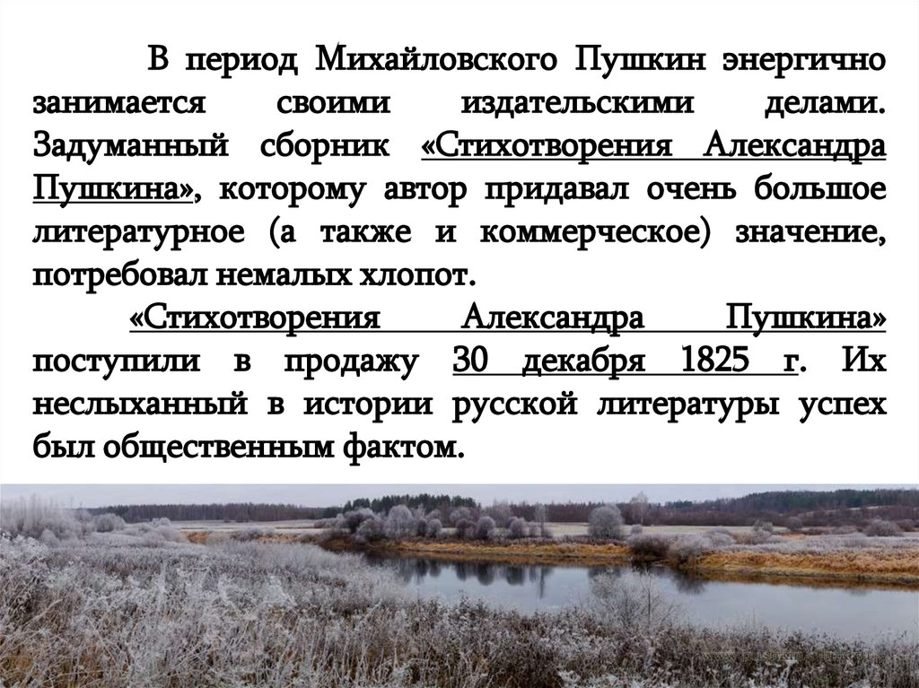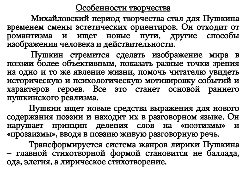 Особенности творчестваМихайловский период творчества стал для Пушкина