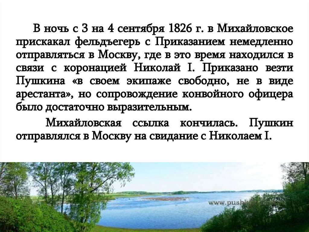 В ночь с 3 на 4 сентября 1826 г. в Михайловскоеприскакал фельдъегерь с Приказанием немедленно