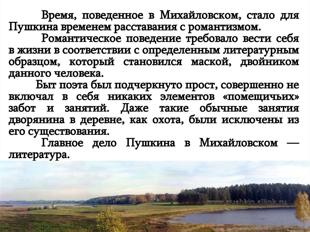 Время, поведенное в Михайловском, стало дляПушкина временем расставания с романтизмом.