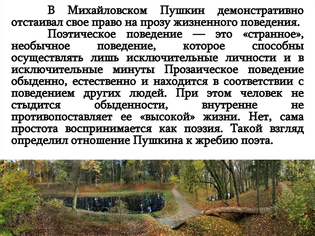 В Михайловском Пушкин демонстративноотстаивал свое право на прозу жизненного поведения.