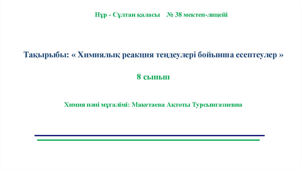 Тақырыбы: « Химиялық реакция теңдеулері бойынша есептеулер »
