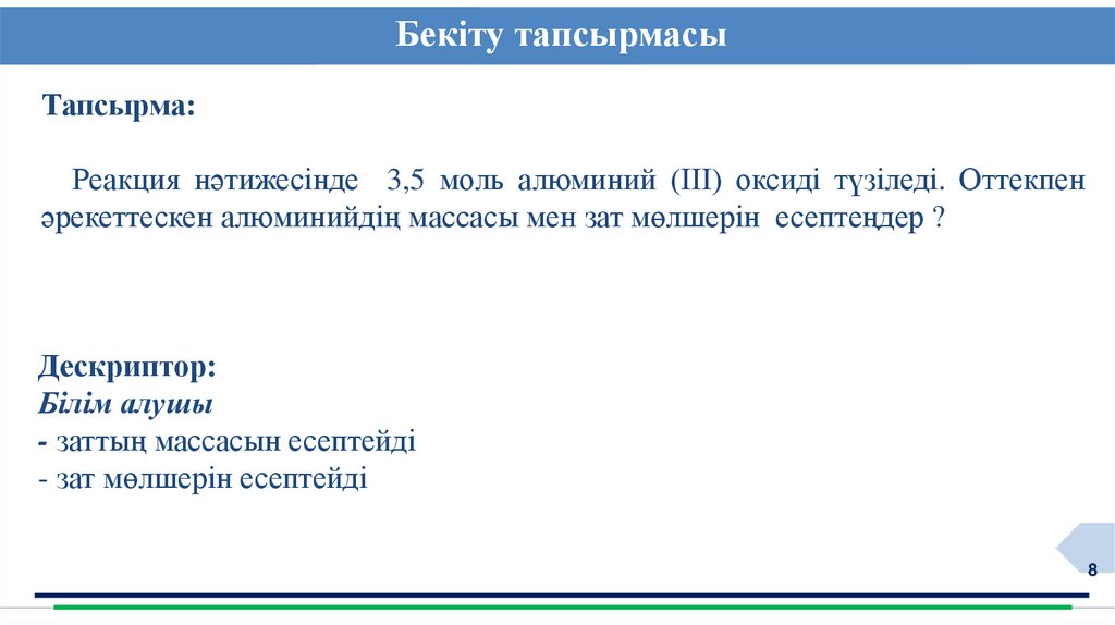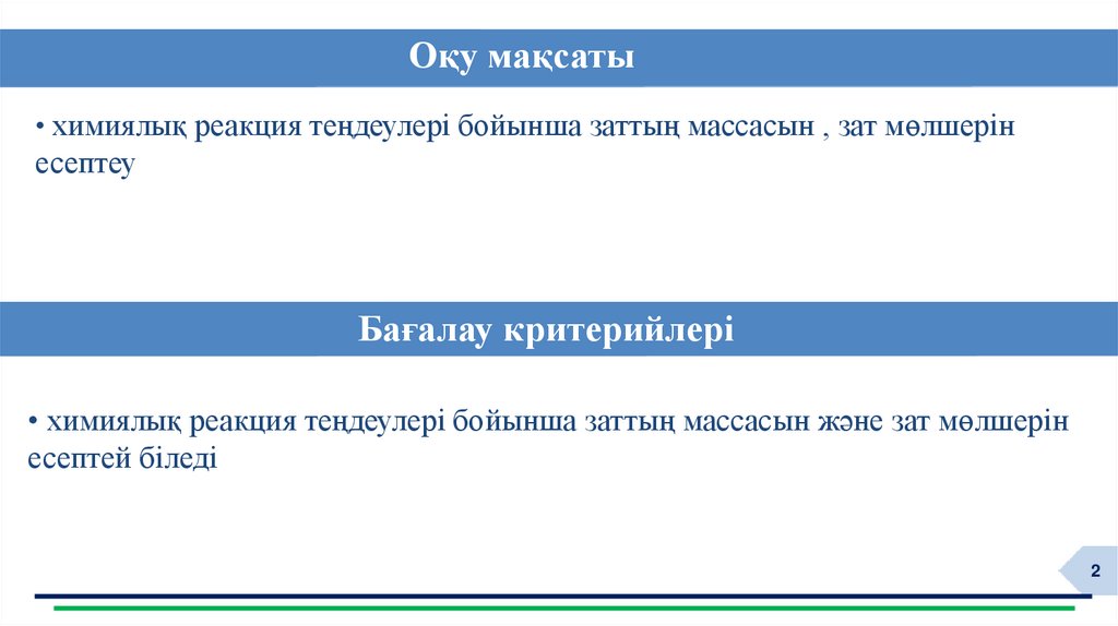 Оқу мақсаты• химиялық реакция теңдеулері бойынша заттың массасын , зат мөлшерін