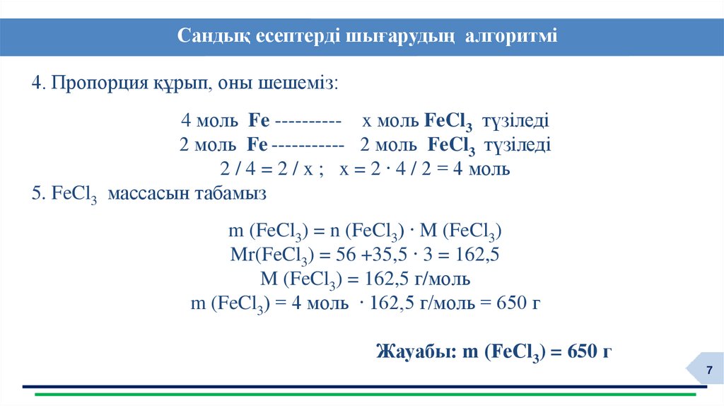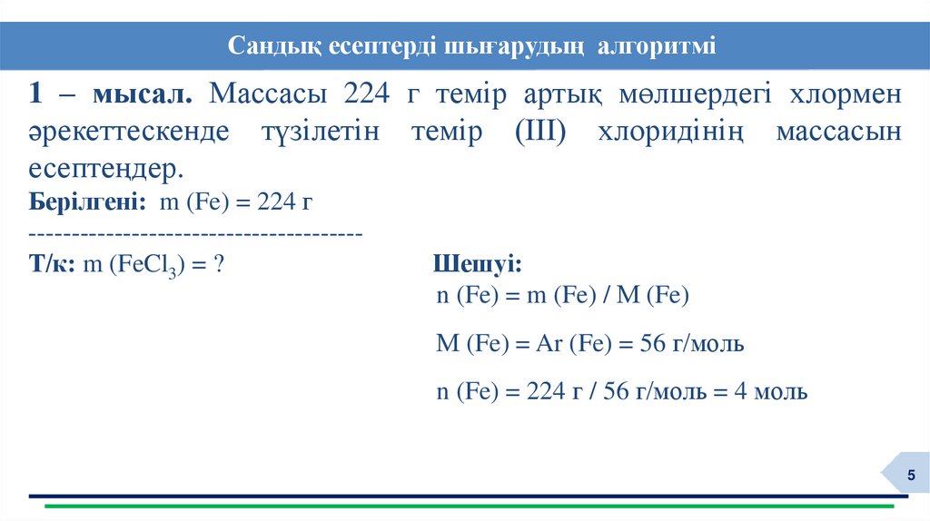 Сандық есептерді шығарудың алгоритмі1 – мысал. Массасы 224 г темір артық мөлшердегі хлормен