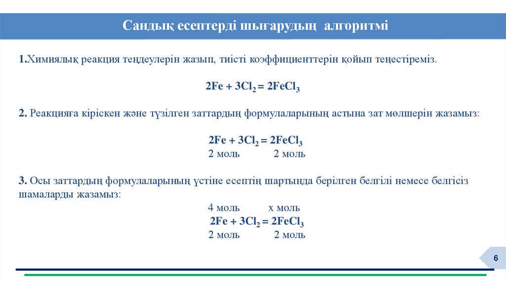 Сандық есептерді шығарудың алгоритмі1.Химиялық реакция теңдеулерін жазып, тиісті коэффициенттерін қойып теңестіреміз.