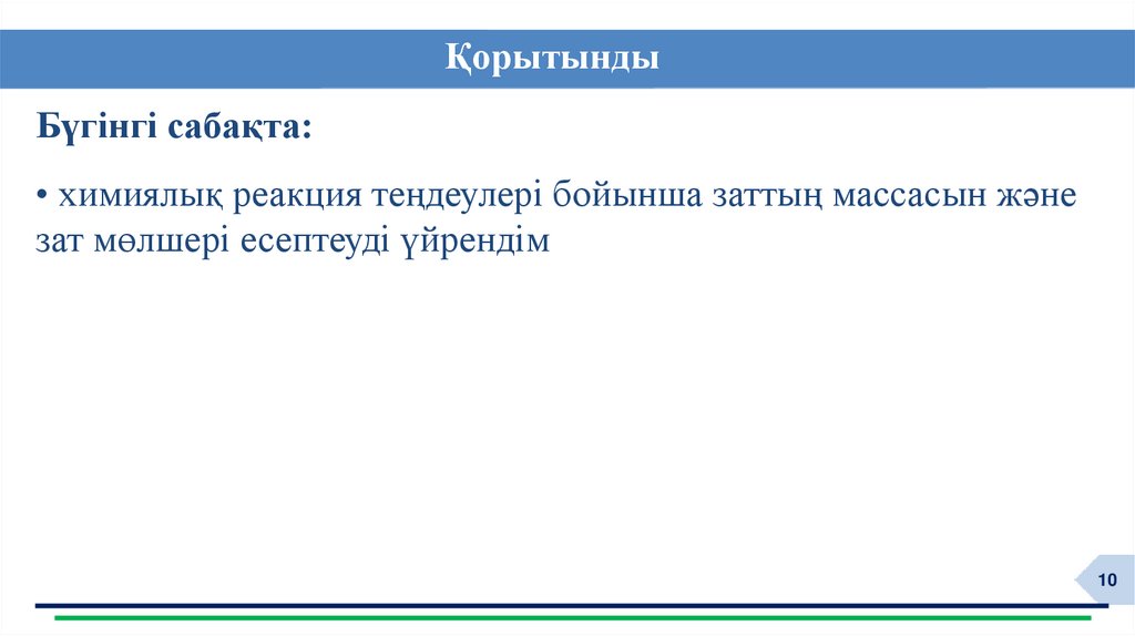 • химиялық реакция теңдеулері бойынша заттың массасын және зат мөлшерін