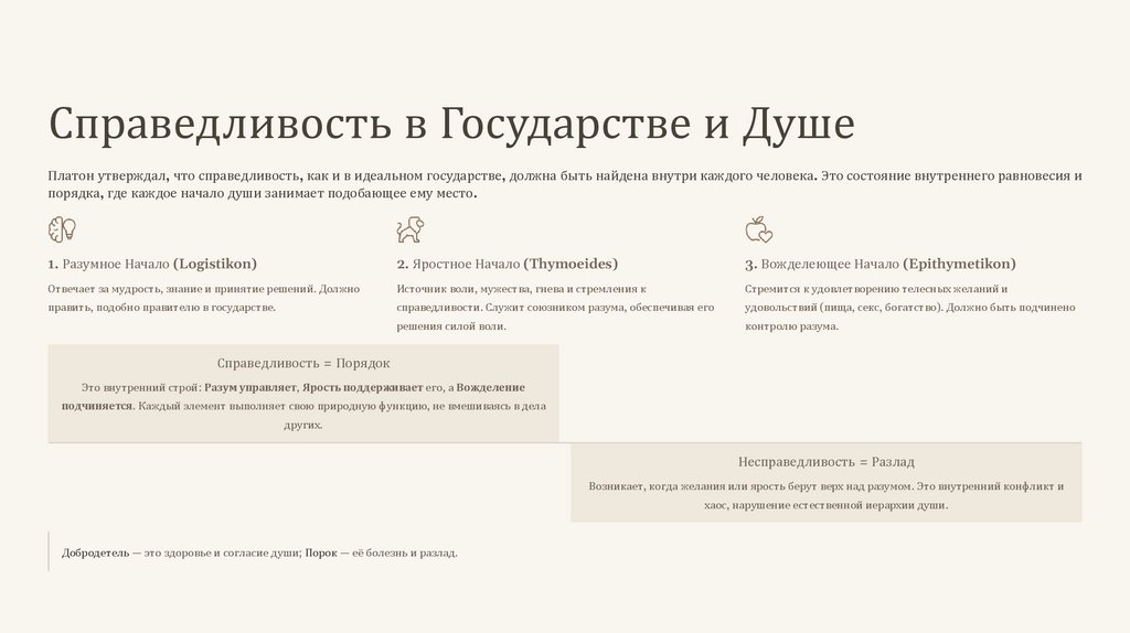 Справедливость в Государстве и ДушеПлатон утверждал, что справедливость, как и в идеальном государстве, должна быть найдена внутри каждого человека. Это состояние внутреннего равновесия и