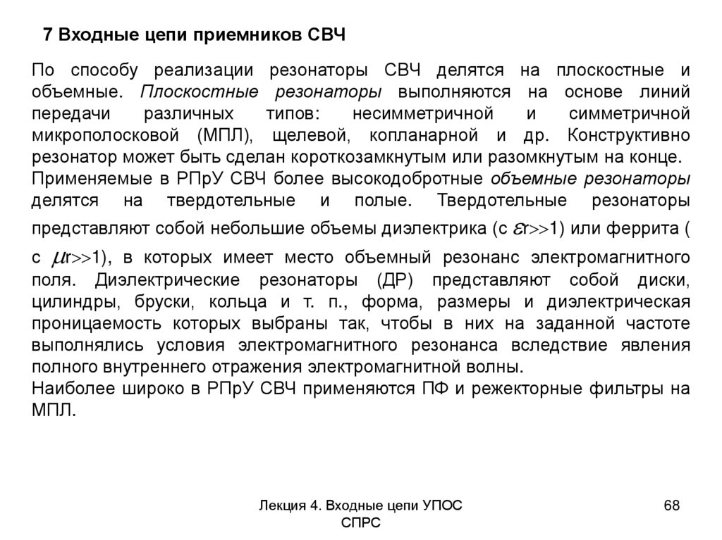 Наиболее широко в РПрУ СВЧ применяются ПФ и режекторные фильтры на
