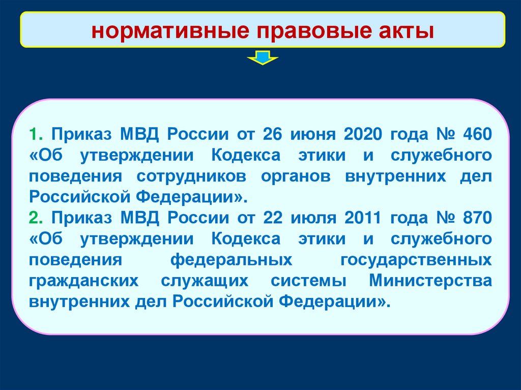 нормативные правовые акты1. Приказ МВД России от 26 июня 2020 года № 460