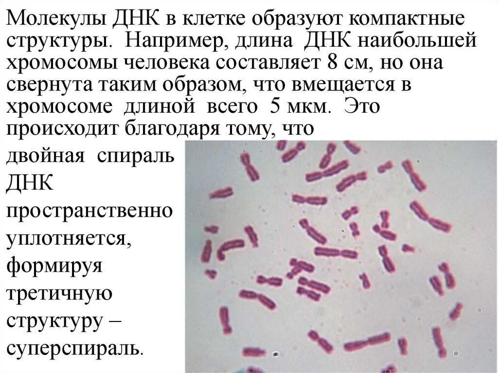 Молекулы ДНК в клетке образуют компактныеструктуры. Например, длина ДНК наибольшей