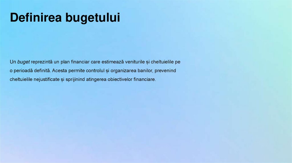 Definirea bugetuluiUn buget reprezintă un plan financiar care estimează veniturile și cheltuielile pe