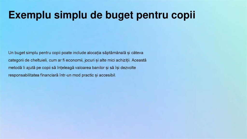 Exemplu simplu de buget pentru copiiUn buget simplu pentru copii poate include alocația săptămânală și câteva