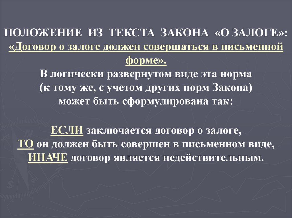 ПОЛОЖЕНИЕ ИЗ ТЕКСТА ЗАКОНА «О ЗАЛОГЕ»:«Договор о залоге должен совершаться в письменной