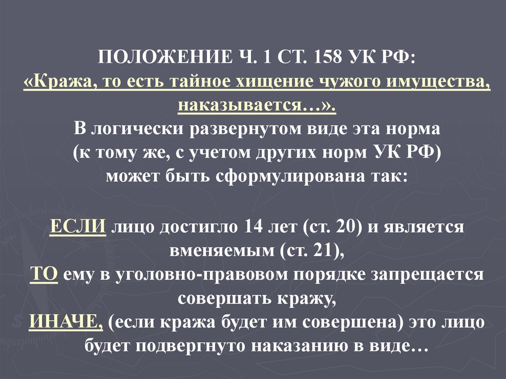 ПОЛОЖЕНИЕ Ч. 1 СТ. 158 УК РФ:«Кража, то есть тайное хищение чужого имущества,