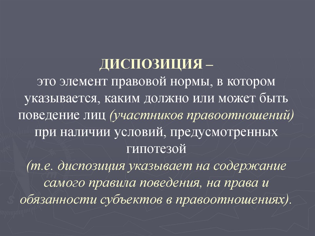 ДИСПОЗИЦИЯ –это элемент правовой нормы, в котором