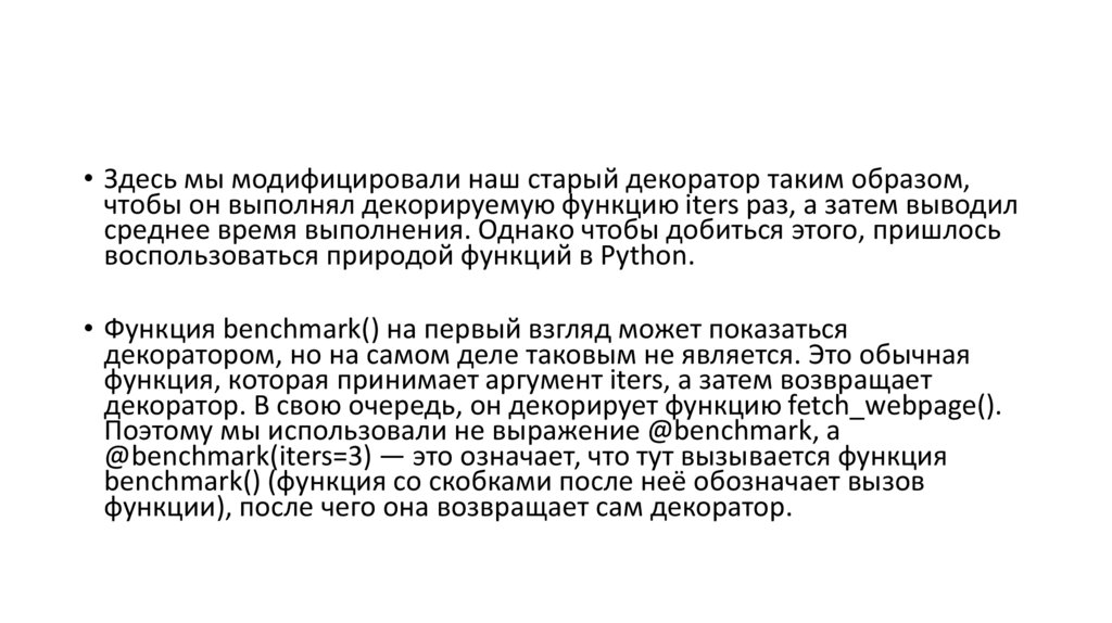 • Здесь мы модифицировали наш старый декоратор таким образом,чтобы он выполнял декорируемую функцию iters раз, а затем выводил