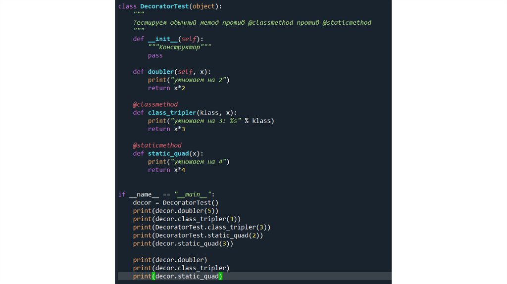 • Декоратор <*@classmethod>* может быть вызван при помощи экземпляракласса, или напрямую, через собственный класс Python в качестве первого