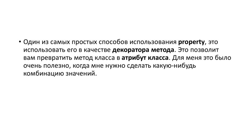 • Один из самых простых способов использования property, этоиспользовать его в качестве декоратора метода. Это позволит