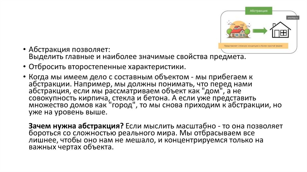 объекта, игнорируя мелкие детали. Абстракция позволяет