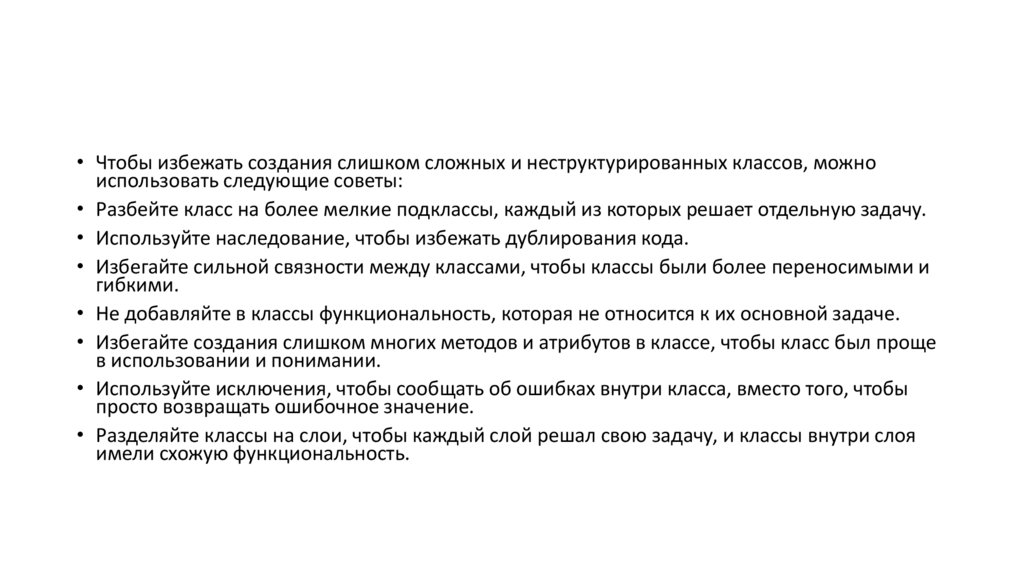 • Чтобы избежать создания слишком сложных и неструктурированных классов, можноиспользовать следующие советы: