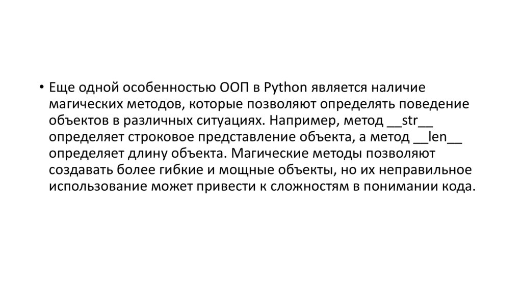 • Еще одной особенностью ООП в Python является наличиемагических методов, которые позволяют определять поведение