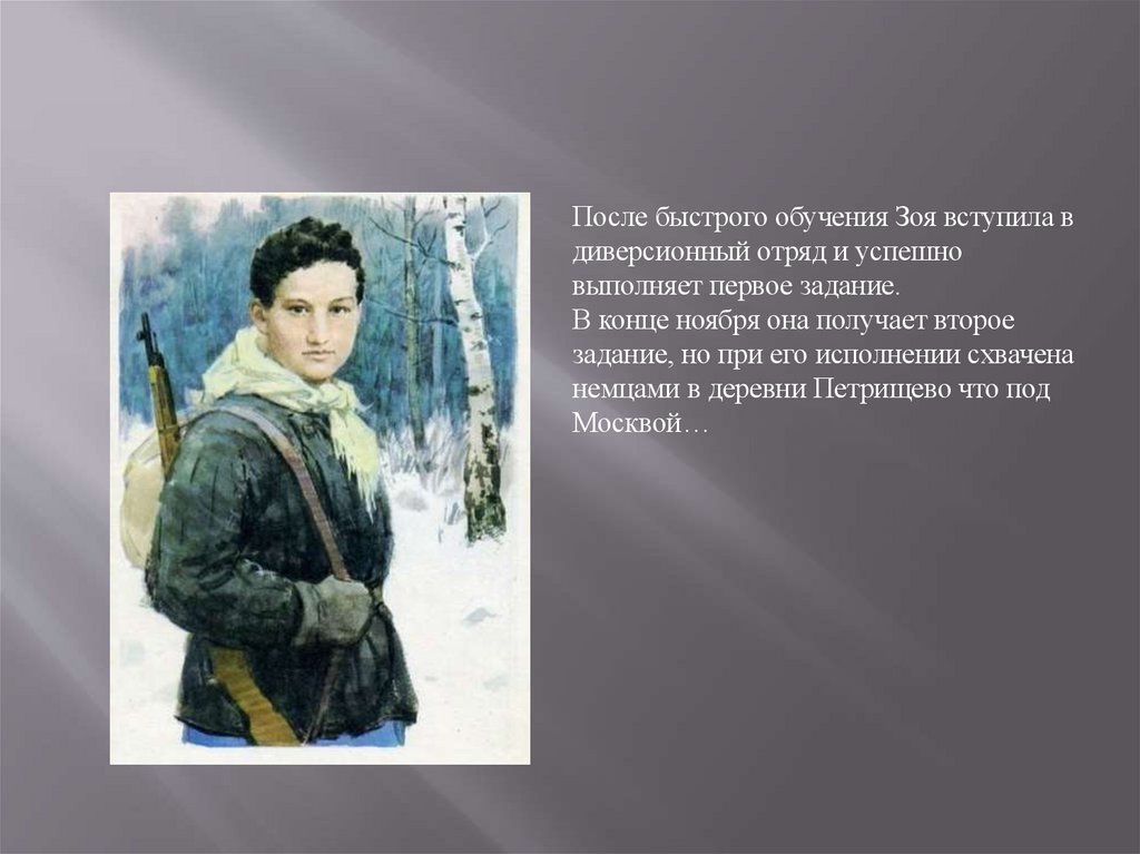 После быстрого обучения Зоя вступила вдиверсионный отряд и успешно
