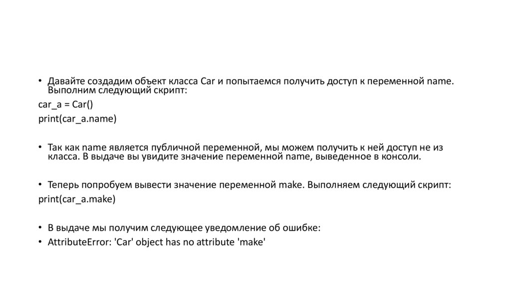 • Давайте создадим объект класса Car и попытаемся получить доступ к переменной name.Выполним следующий скрипт: