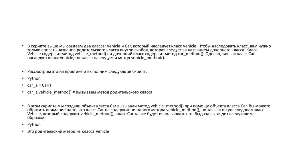 • В этом скрипте мы создали объект класса Car вызывали метод vehicle_method() при помощи объекта класса Car. Вы можете