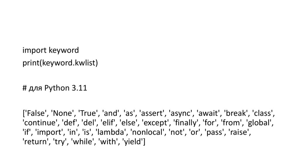 ['False', 'None', 'True', 'and', 'as', 'assert', 'async', 'await', 'break', 'class',