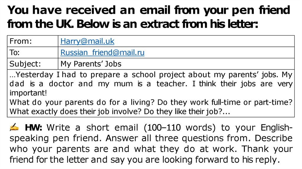 HW: Write a short email (100–110 words) to your Englishspeaking pen friend. Answer all three questions from. Describe