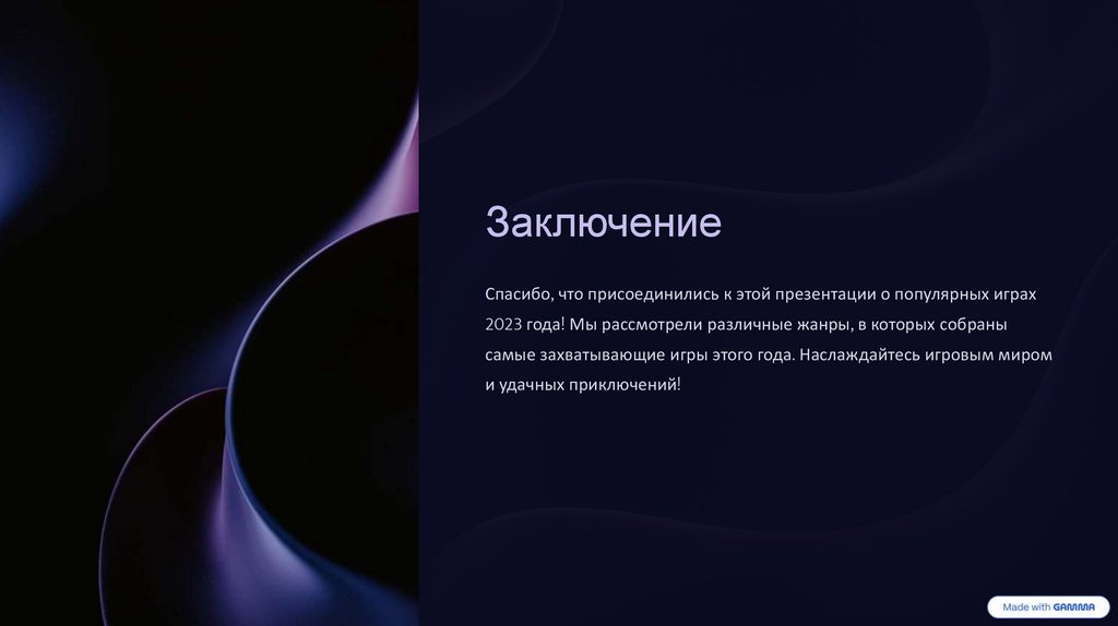 ЗаключениеСпасибо, что присоединились к этой презентации о популярных играх