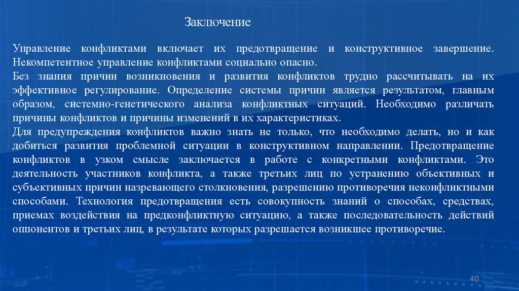 ЗаключениеУправление конфликтами включает их предотвращение и конструктивное завершение.