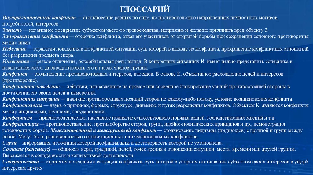 ГЛОССАРИЙВнутриличностный конфликт — столкновение равных по силе, но противоположно направленных личностных мотивов,