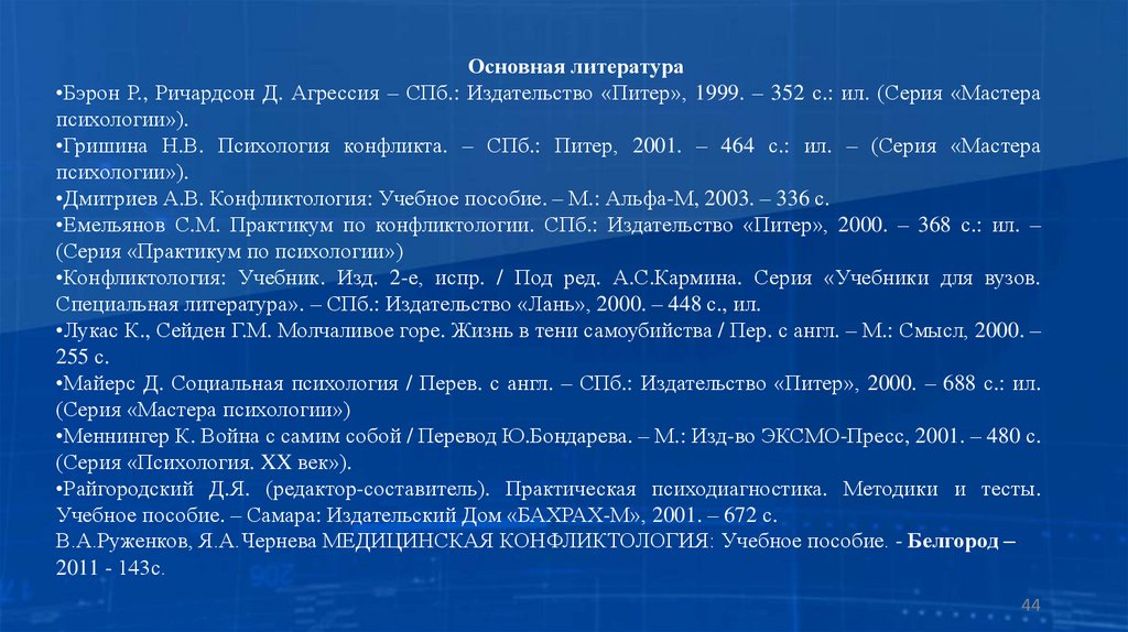 Основная литература•Бэрон Р., Ричардсон Д. Агрессия – СПб.: Издательство «Питер», 1999. – 352 с.: ил. (Серия «Мастера