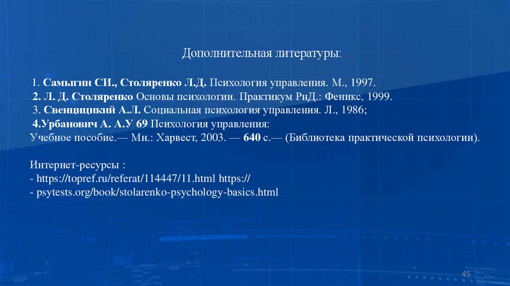 Дополнительная литературы:1. Самыгин СИ., Столяренко Л.Д. Психология управления. М., 1997.