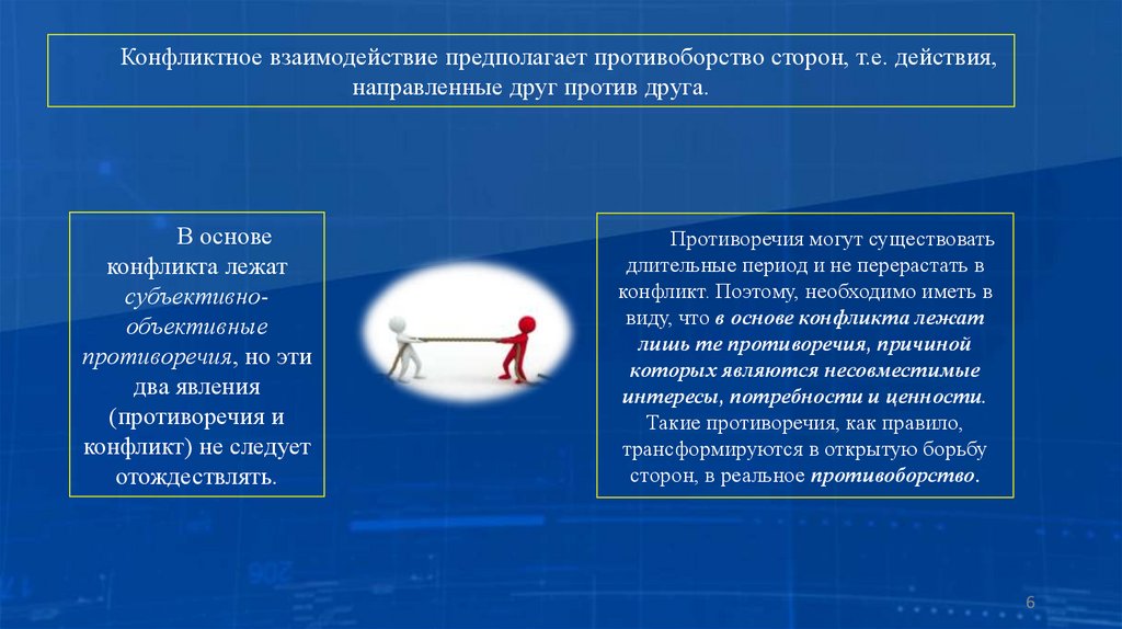 Конфликтное взаимодействие предполагает противоборство сторон, т.е. действия,направленные друг против друга.